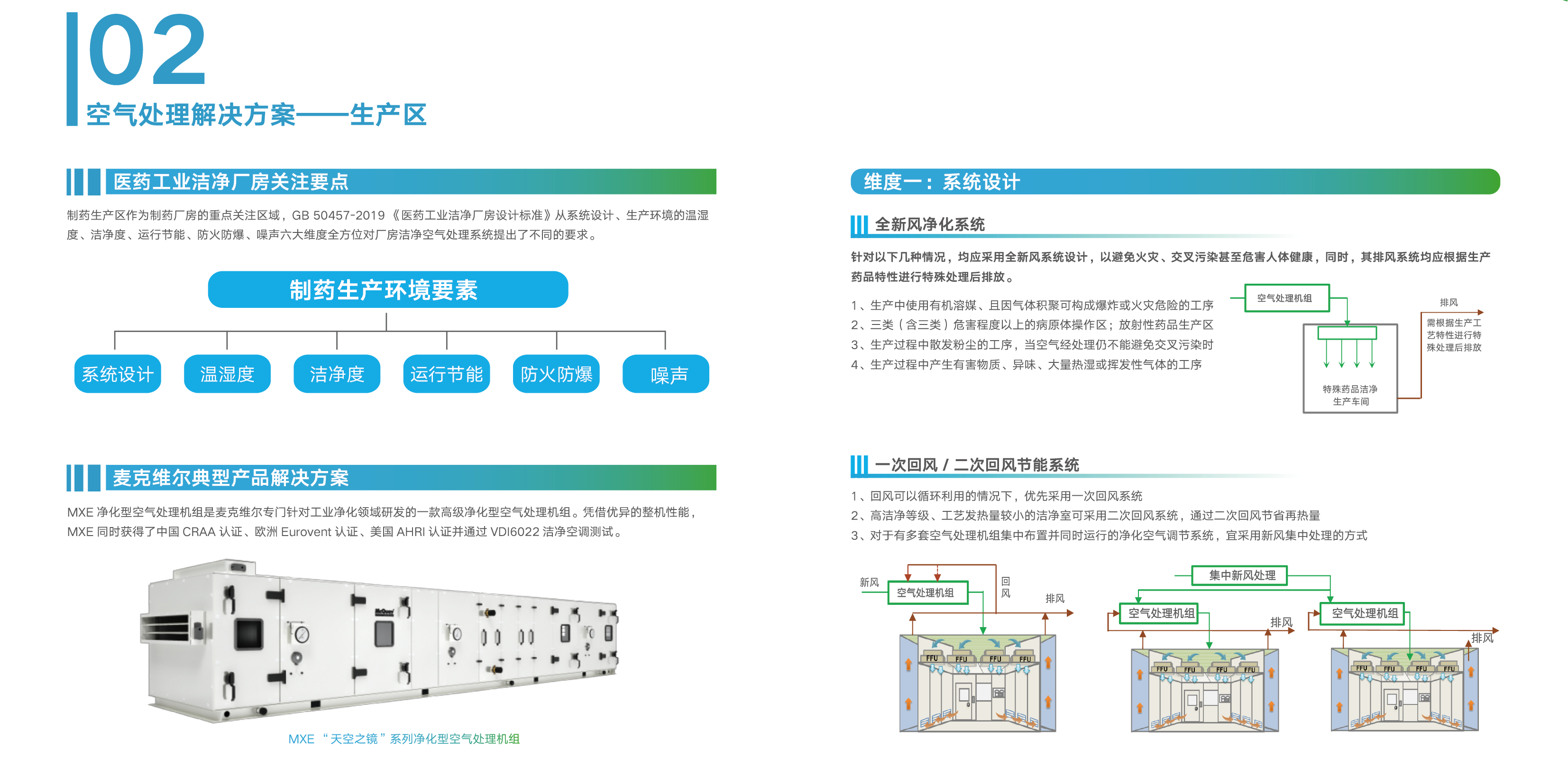 麥克維爾作為專注工業領域提供完善的空調冷熱源和空氣凈化系統方案的領導者,一直致力于對制藥空調系統的思考與研發,通過對制藥企業空調系統的技術研究,進一步明確制藥空調系統的重要性,開發出一系列綠色、高效、凈化型產品,助力建造符合GMP規定的高效制藥廠房,以保障制藥行業的持續、穩定、綠色發展。
