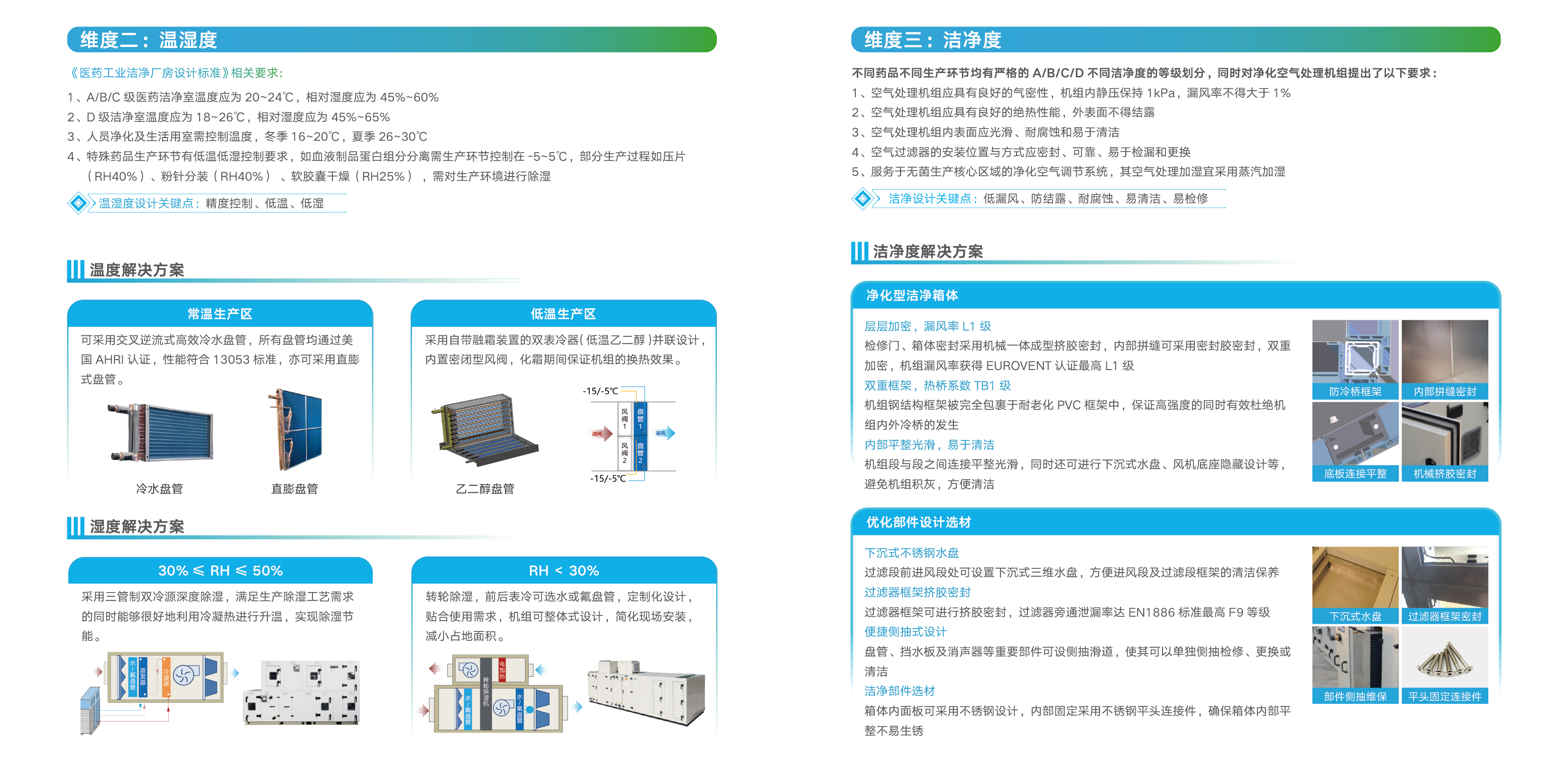 制藥凈化生產車間根據其空氣懸浮粒子及微生物濃度控制分為A/B/C/D四個凈化等級,不同等級車間及人員凈化生活用室的溫濕度控制也有明確的規定,因此對我們的末端空氣處理機組提出了更高的凈化技術和控制要求。