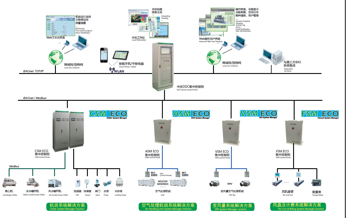怡控TM系統(tǒng)解決方案是麥克維爾針對樓宇暖通系統(tǒng)中各個設(shè)備,向客戶提供完整的、有效的設(shè)備集中管理和監(jiān)控,通過自動化的控制策略和操作實現(xiàn)系統(tǒng)性的節(jié)能。根據(jù)受控設(shè)備來分,怡控TM系統(tǒng)包含有CSM ECO(冷水機(jī)組系統(tǒng)管理),ASM ECO(風(fēng)柜系統(tǒng)管理),F(xiàn)SM ECO(風(fēng)機(jī)盤管系統(tǒng)管理),VSM ECO(變風(fēng)量空調(diào)箱系統(tǒng)管理)等不同子方案。